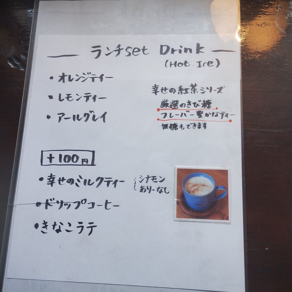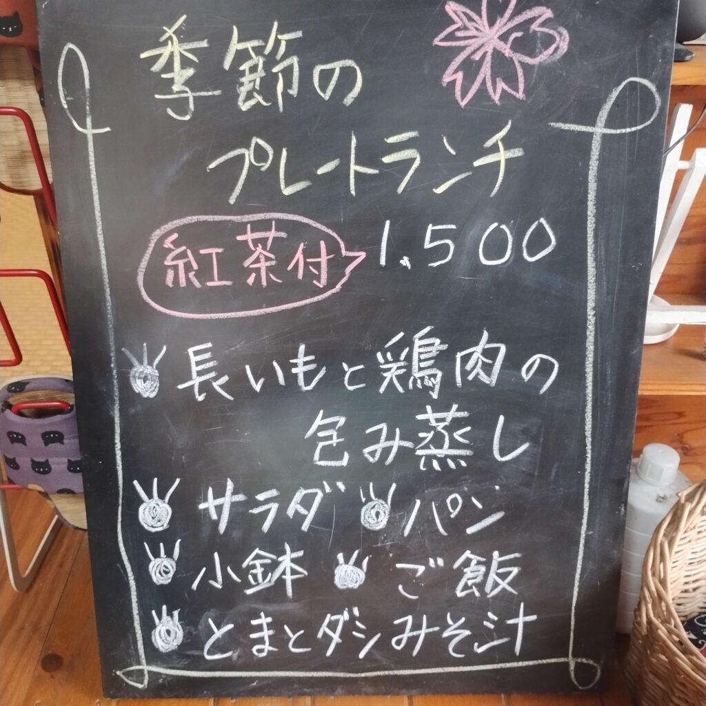 今回は入口の黒板にあった「季節のプレートランチ(紅茶付き)」をオーダー。紅茶はアールグレイを選択しました。