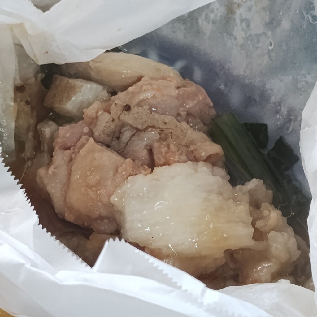 メインの長芋と鶏肉の包み蒸しは、長芋のシャキッとした食感と加熱による甘みが印象的。鶏肉も柔らかく、旨味がしっかり凝縮されています。