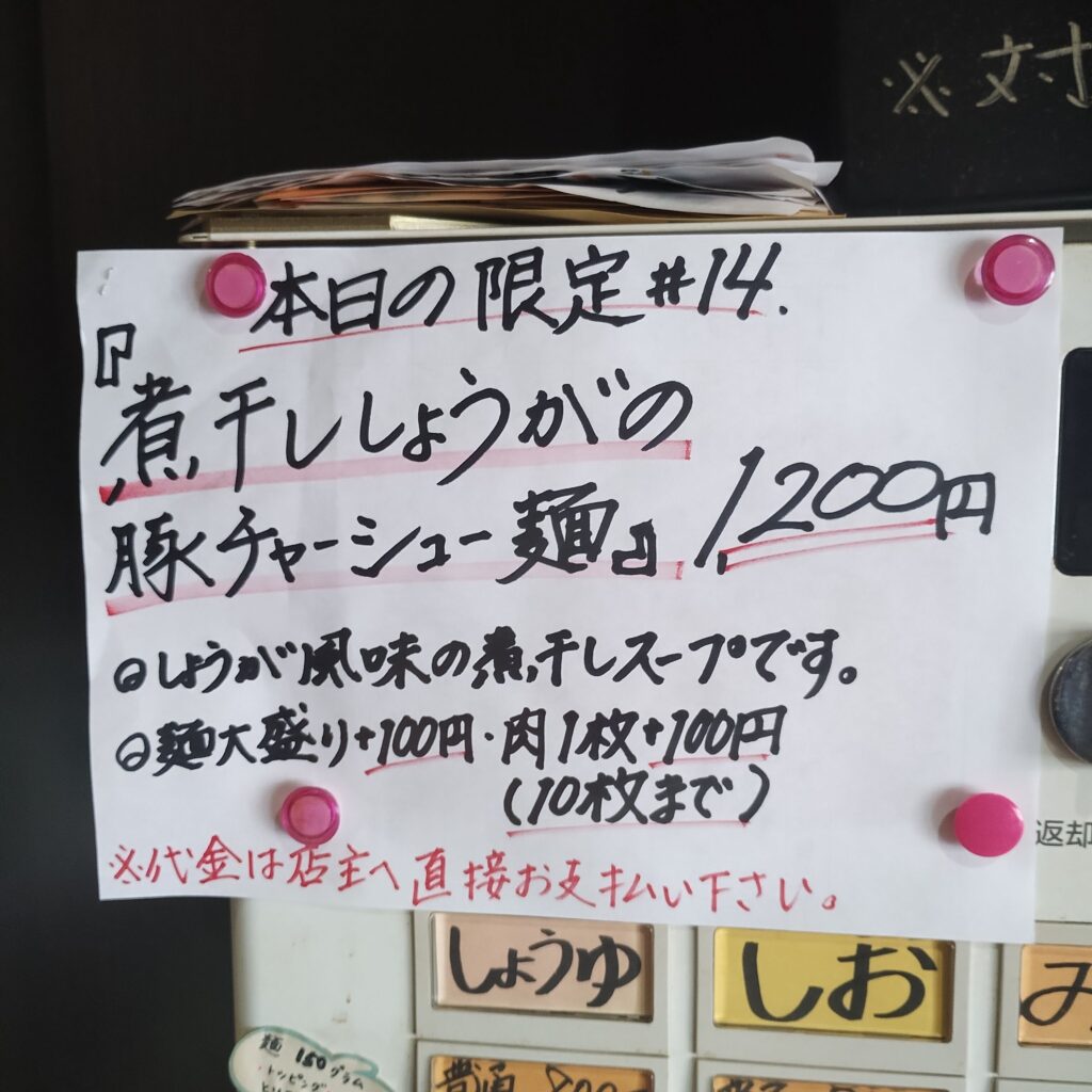 無化調で丁寧なラーメンが評判のこちらのお店。この日は迷わず「本日の限定」から「煮干ししょうがの豚チャーシュー麺」をチョイス。麺は縮れ麺でオーダーしました。