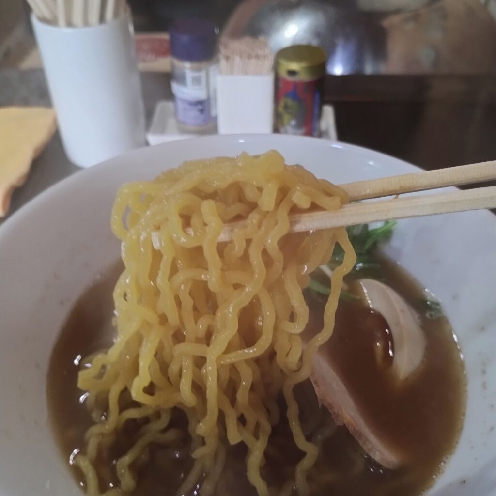まずスープを一口。煮干しの旨味がしっかり感じられつつ、無化調らしいクリアで優しい飲み口。そこに生姜の風味がふわっと広がり、後味をキリッと引き締めてくれます。