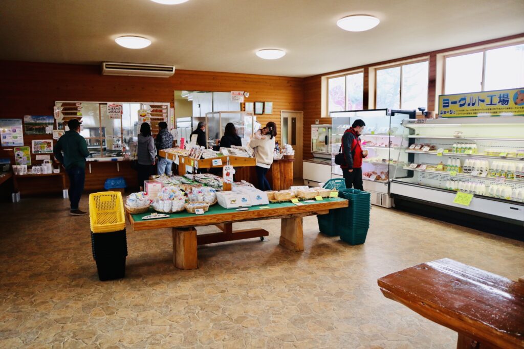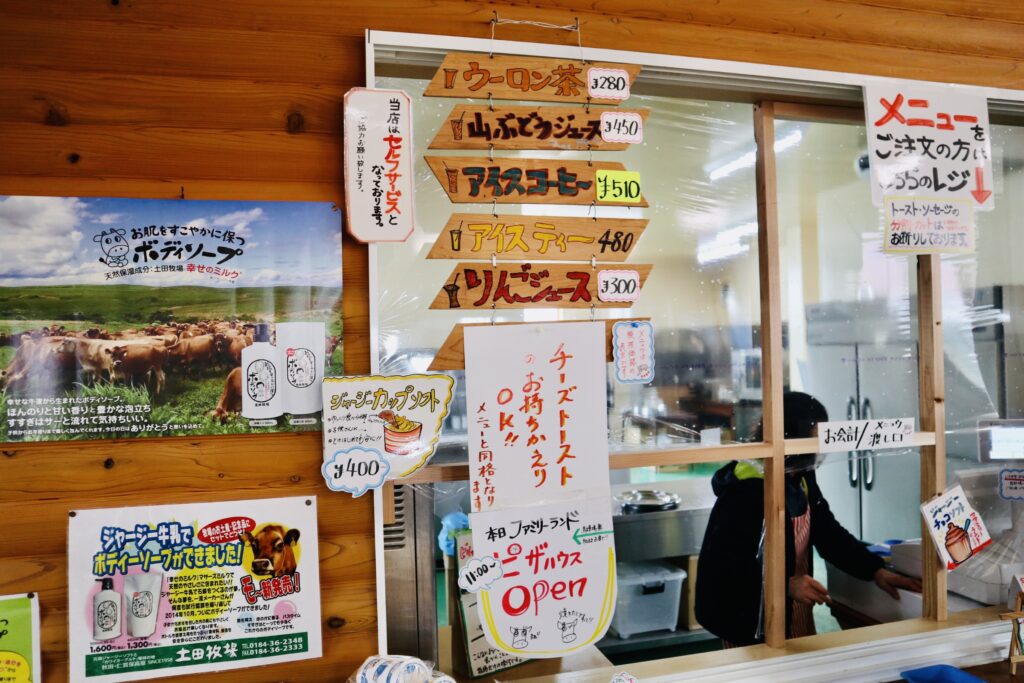 場所は、国道7号線を山形方面に向かい、郵便局前交差点の信号を左折し、県道32号仁賀保矢島館合線に入ります。そのまま峠道を約7km進むと「土田牧場」などの案内看板のある丁字路になりますので、そこ右折。そこから約3km進んだ左手に有ります。駐車場は、牧場前に10台程。営業時間は、9:00~17:00で、無休ですが1月~2月の冬季期間は休業してます。